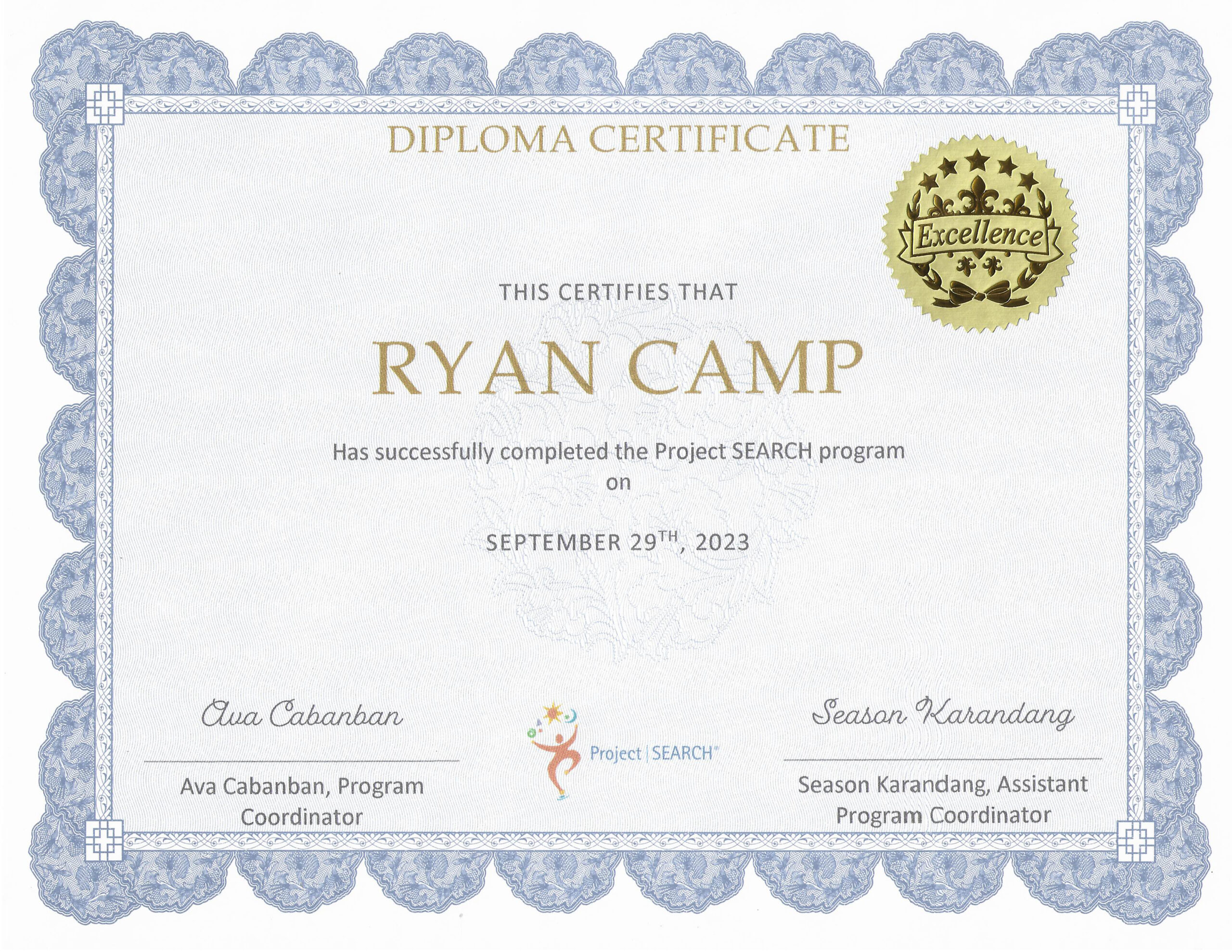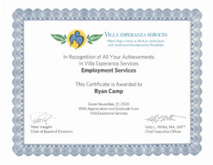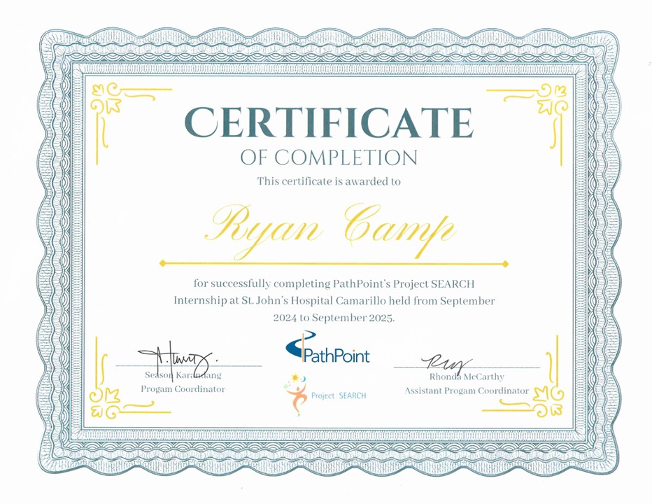Ryan is committed to lifelong learning and skill building. He recently completed the Career and Workplace Readiness program (HBM-51) at Fresno Pacific University in September 2025, further strengthening his independence and professional abilities. He also holds a California Food Handlers Certification from Premier Food Safety and earned his high school certificate from Atascadero High School, Class of 2005.